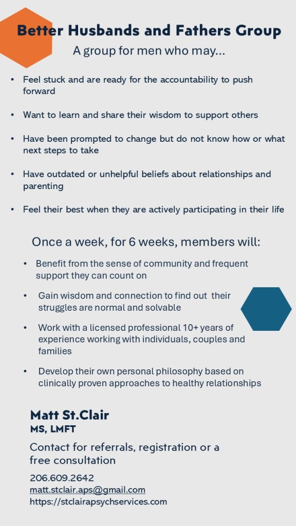 Join the 6-week skills and personal growth group facilitated by me, Matt St.Clair, MS, LMFT. Through small group discussion, education and comradery, you will learn clinically informed ways to build stronger relationships, grow personally, and connect with purpose. Fill out the form below to register below or email your interest/questions to: matt.stclair.APS@gmail.com and I will follow up with you as soon as possible.